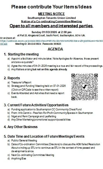 SUNDAY 1ST MARCH AT 2:00 PM at Flat 23, Kingsland Court, South Front, Southampton, SO14 1JN. Sunday 01/02/2026 at 2:00 pm at Flat 23, Kingsland Court, South Front, Southampton, SO14 1JN. Or on Zoom at https://us06web.zoom.us/j/4042438024?pwd=M1VNcGtoYzN1bHI2R2lXbkwvZlhjdz09&omn=84903197425